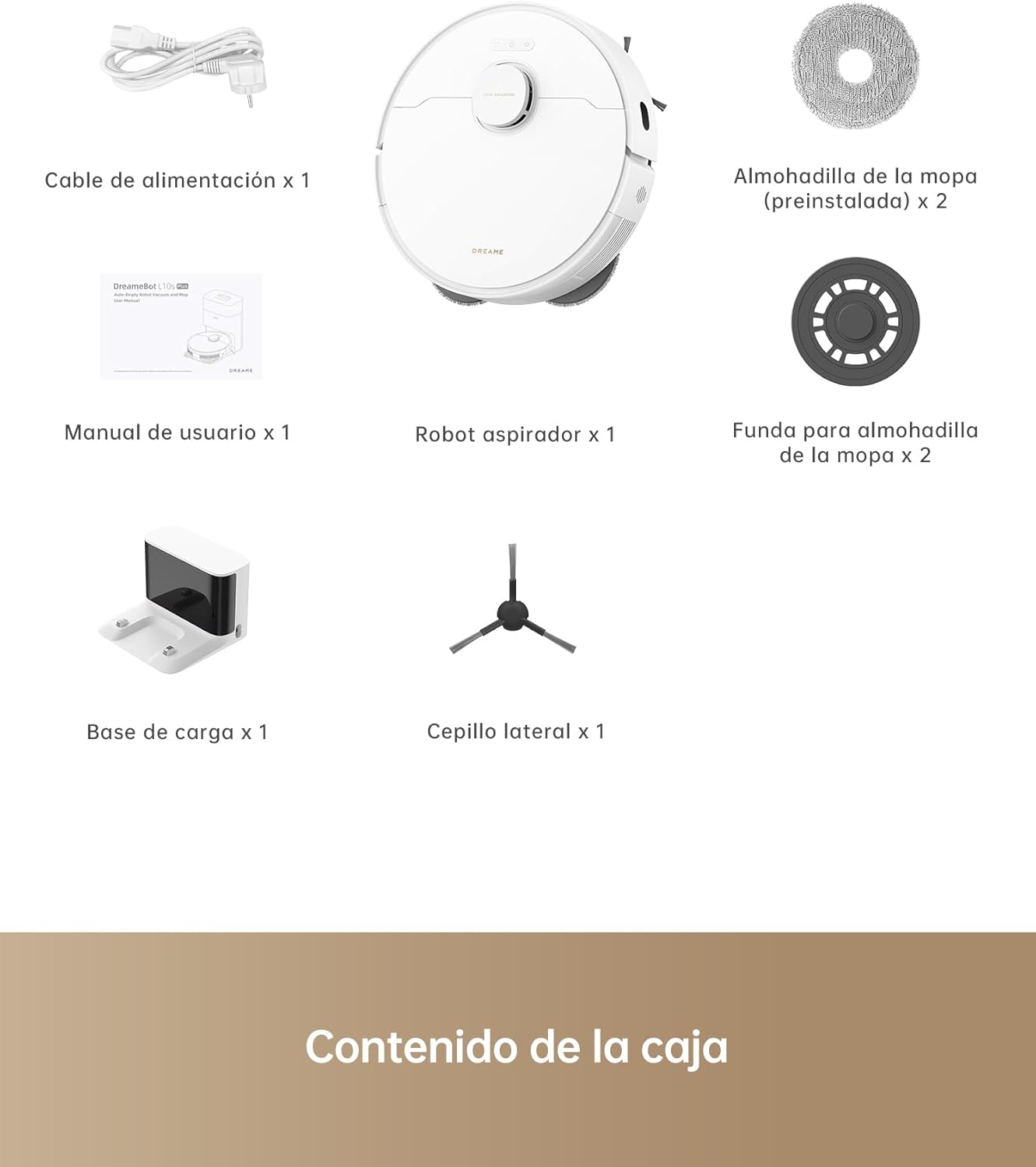 1x Robot aspirador L10s Pro Gen 2, 1x Base de carga compacta, 1x Cepillo lateral, 2x Soportes para mopas con almohadillas, 1x Cable de alimentación, Manual de instrucciones.